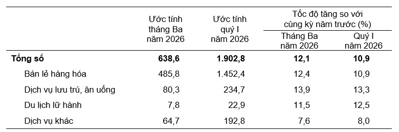 Tổng mức bán lẻ hàng hóa và doanh thu dịch vụ tiêu dùng tháng 3/2026 ước tăng 12.1% so với cùng kỳ năm trước. Tính chung quý 1/2026, tổng mức bán lẻ hàng hóa và doanh thu dịch vụ tiêu dùng tăng 10.9% so với cùng kỳ năm trước, trong đó: Doanh thu dịch vụ lưu trú, ăn uống tăng 13.3% và doanh thu du lịch lữ hành tăng 12.5%.