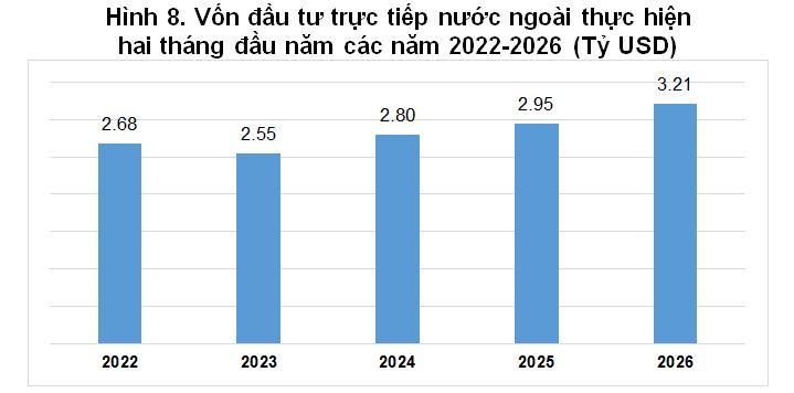 Vốn đầu tư trực tiếp nước ngoài thực hiện tại Việt Nam hai tháng đầu năm 2025 ước đạt 3.21 tỷ USD, tăng 8.8% so với cùng kỳ năm trước. Đây là số vốn đầu tư trực tiếp nước ngoài thực hiện cao nhất của hai tháng đầu năm trong 5 năm qua. Trong đó: Công nghiệp chế biến, chế tạo đạt 2.65 tỷ USD, chiếm 82.7% tổng vốn đầu tư trực tiếp nước ngoài thực hiện; hoạt động kinh doanh bất động sản đạt 223.5 triệu USD, chiếm 7.0%; sản xuất, phân phối điện, khí đốt, nước nóng, hơi nước và điều hòa không khí đạt 119.2 triệu USD, chiếm 3.7%.
