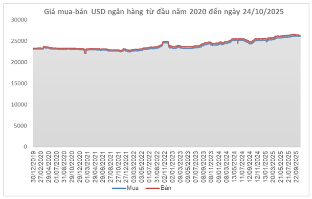Tại Việt Nam, tỷ giá trung tâm ngày 24/10 được Ngân hàng Nhà nước công bố ở mức 25,098 đồng/USD, giảm 3 đồng so với cuối tuần trước, ghi nhận tuần giảm thứ tư liên tiếp. Với biên độ ±5%, tỷ giá giao dịch tại các ngân hàng thương mại được phép dao động trong khoảng 23,843 – 26,353 đồng/USD.