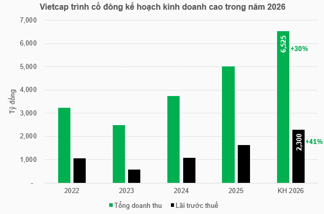 Dựa trên nhiều dự báo tích cực về thị trường chứng khoán và định hướng hoạt động của Công ty, HĐQT đề xuất kế hoạch kinh doanh năm 2026 với tổng doanh thu 6,525 tỷ đồng và lãi trước thuế 2,300 tỷ đồng, lần lượt tăng 30% và 41% so với con số thực hiện năm 2025. Về cổ tức, HĐQT Vietcap dự trình kế hoạch chia dự kiến 5 - 12%.