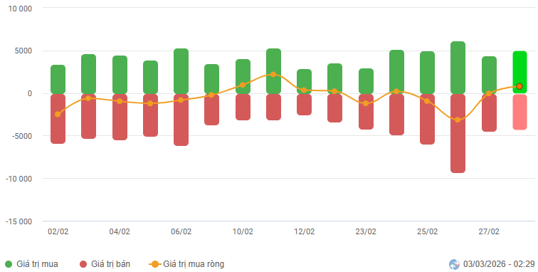 Biến động của dòng tiền từ khối ngoại: Khối ngoại mua ròng trong phiên giao dịch ngày 02/03/2026. Nếu nhà đầu tư nước ngoài duy trì hành động này trong những phiên tới thì tình hình có thể bớt bi quan hơn.