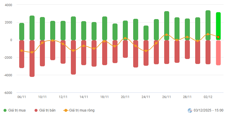 Biến động của dòng tiền từ khối ngoại: Khối ngoại tiếp tục mua ròng trong phiên giao dịch ngày 03/12/2025. Nếu nhà đầu tư nước ngoài duy trì hành động này trong những phiên tới thì tình hình sẽ càng lạc quan hơn.