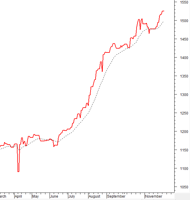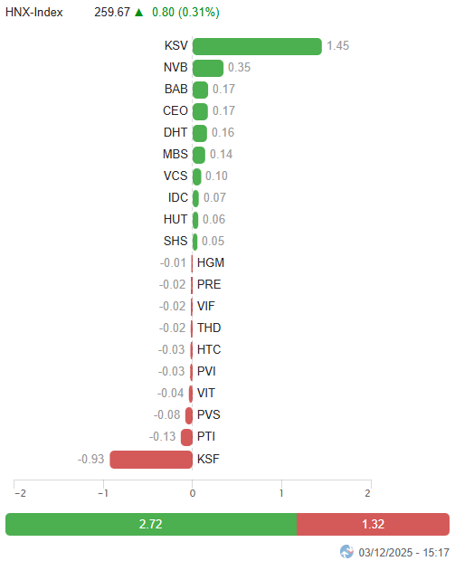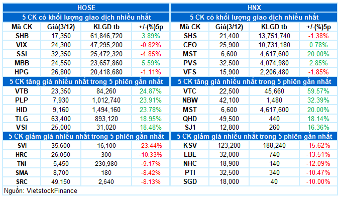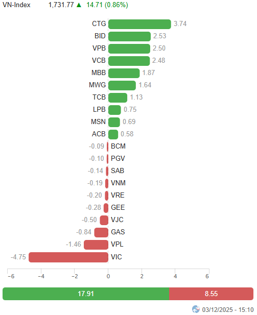 - Thị trường tiếp tục bứt phá trong phiên 03/12 với sắc xanh áp đảo ngay từ đầu ngày. Dù các trụ lớn nhà Vingroup xuất hiện nhịp điều chỉnh khiến VN-Index rung lắc trong phiên sáng, nhưng độ rộng thị trường lại cải thiện rõ rệt so với các phiên trước khi phần lớn nhóm ngành đều duy trì trạng thái tích cực. Chính sự đồng thuận này giúp tâm lý nhà đầu tư hứng khởi hơn trong phiên chiều, kéo theo lực cầu tham gia mạnh mẽ hơn. Kết phiên, VN-Index đóng cửa tại 1,731.77 điểm, tăng 0.86% so với phiên trước.