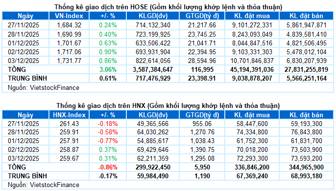 - Các chỉ số chính tiếp tục bật tăng trong phiên giao dịch ngày 03/12. Cụ thể, VN-Index tăng 0.86%, lên mức 1,731.77 điểm; HNX-Index tăng nhẹ 0.31%, đạt 259.67 điểm.