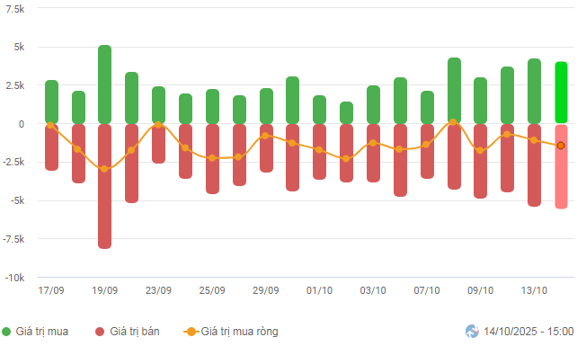Biến động của dòng tiền từ khối ngoại: Khối ngoại tiếp tục bán ròng trong phiên giao dịch ngày 14/10/2025. Nếu nhà đầu tư nước ngoài duy trì hành động này trong những phiên tới thì tình hình có thể trở nên bi quan hơn.