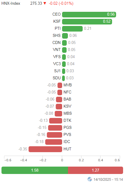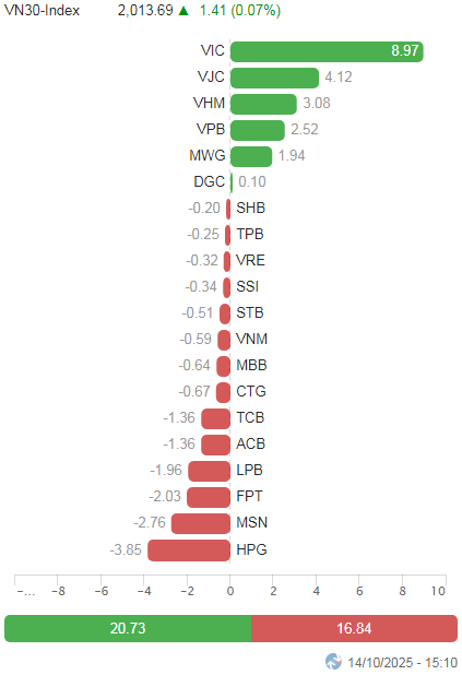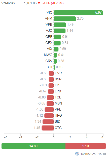 - Đà hưng phấn từ nhóm cổ phiếu trụ tiếp tục giúp VN-Index mở cửa phiên 14/10 đầy hứng khởi với gap tăng gần 18 điểm. Chỉ số nhanh chóng tiến gần mốc 1,800 điểm chỉ sau hơn nửa giờ giao dịch, tuy nhiên đà tăng dần chững lại sau đó. Dù được dẫn dắt bởi loạt cổ phiếu lớn thuộc các nhóm tài chính, bất động sản và công nghiệp, thị trường vẫn thể hiện rõ trạng thái phân hóa. Số lượng cổ phiếu giảm tiếp tục chiếm áp đảo như những phiên gần đây cho thấy dòng tiền chưa thực sự lan tỏa. Bước sang phiên chiều, sự suy yếu trên diện rộng khiến nỗ lực kéo trụ không thể duy trì. VN-Index thu hẹp dần đà tăng và đảo chiều giảm điểm, đóng cửa tại 1,761.06 điểm, mất hơn 4 điểm so với phiên trước và rơi hơn 33 điểm so với mức cao nhất trong ngày.