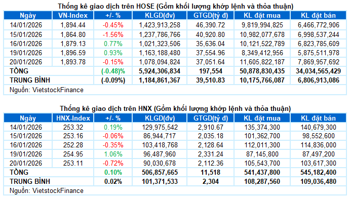 - Các chỉ số chính quay lại giảm điểm trong phiên giao dịch ngày 20/01. VN-Index giảm nhẹ 2.81 điểm (-0.15%), dừng tại 1,893.78 điểm. HNX-Index cũng mất 1.84 điểm (-0.72%), về mức 253.11 điểm.