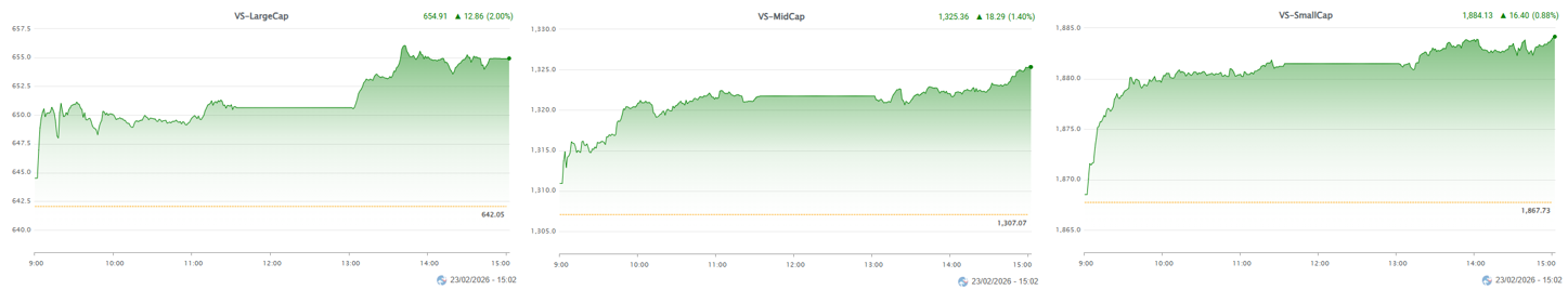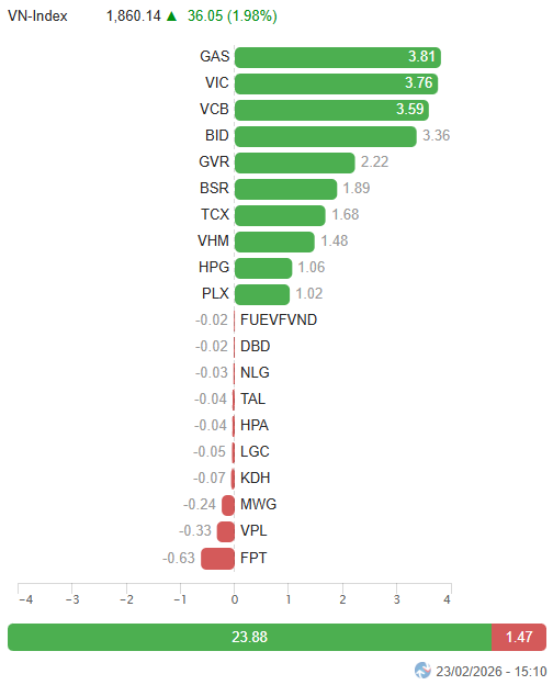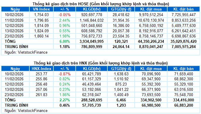 - Các chỉ số chính đồng loạt tăng điểm trong phiên giao dịch ngày 23/02. Cụ thể, VN-Index tăng 1.98%, đạt 1,860.14 điểm. Tương tự, HNX-Index cũng tăng 1.86%, lên mức 261.83 điểm.