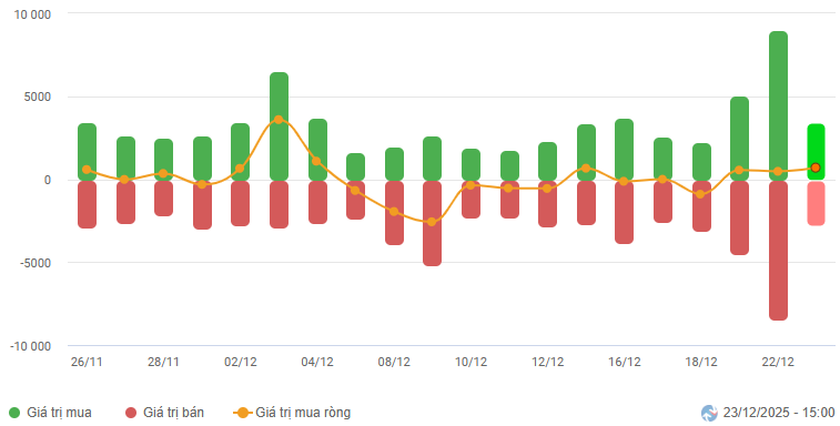 Biến động của dòng tiền từ khối ngoại: Khối ngoại tiếp tục mua ròng trong phiên giao dịch ngày 23/12/2025. Nếu nhà đầu tư nước ngoài duy trì hành động này trong những phiên tới thì đà tăng sẽ còn tiếp diễn.