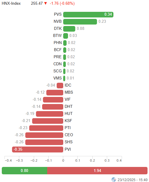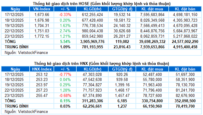 - Các chỉ số chính tăng giảm trái chiều trong phiên giao dịch ngày 23/12. VN-Index tăng mạnh 1.21%, lên mức 1,772.15 điểm. Trong khi đó, HNX-Index giảm 0.68%, xuống còn 255.47 điểm.