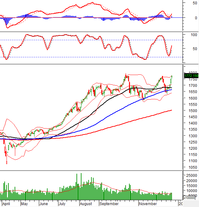 VN-Index thiết lập đỉnh lịch sử mới (tính theo giá đóng cửa) với phiên tăng thứ 4 liên tiếp đồng thời bám vào Upper Band của Bollinger Bands. Các chỉ báo MACD và Stochastic Oscillator tiếp tục hướng lên tích cực sau khi cho tín hiệu mua. Kết quả test đỉnh cũ tháng 10/2025 (tương đương vùng 1,740-1,795 điểm) sẽ quyết định xu hướng của chỉ số trong thời gian tới.