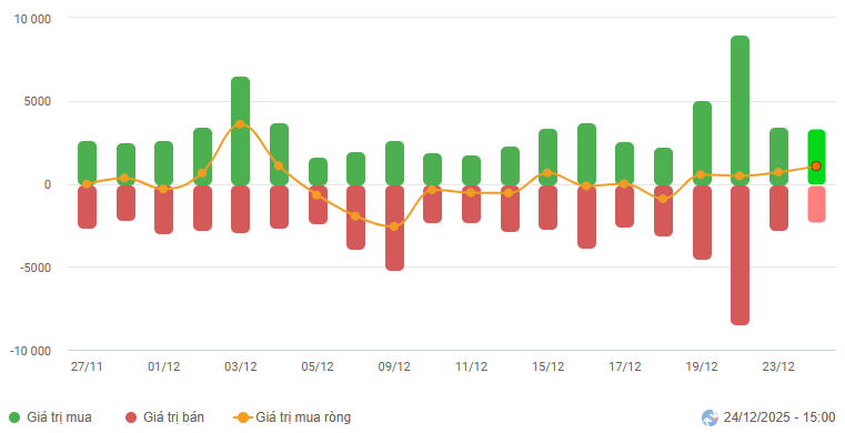 Biến động của dòng tiền từ khối ngoại: Khối ngoại tiếp tục mua ròng trong phiên giao dịch ngày 24/12/2025. Nếu nhà đầu tư nước ngoài duy trì hành động này trong những phiên tới thì đà tăng sẽ còn tiếp diễn.