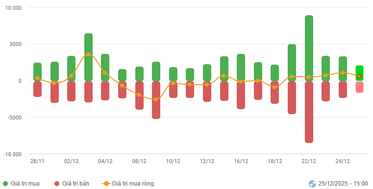 Biến động của dòng tiền từ khối ngoại: Khối ngoại tiếp tục mua ròng trong phiên giao dịch ngày 25/12/2025. Nếu nhà đầu tư nước ngoài duy trì hành động này trong những phiên tới thì tình hình có thể cải thiện hơn.