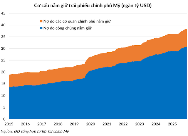 Thống kê của Bộ Tài chính Mỹ tính đến ngày 24/12/2025 cho thấy nợ công của Mỹ là hơn 38.3 ngàn tỷ USD, trong đó 80% là loại có thể chuyển nhượng, do công chúng nắm giữ.