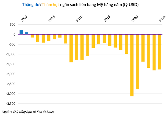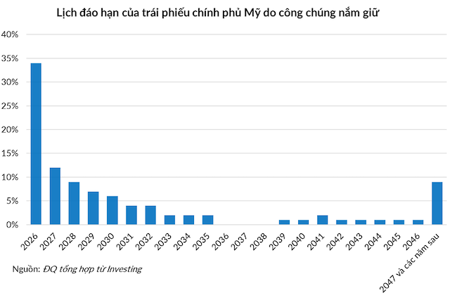 Theo Ủy ban Kinh tế Hỗn hợp của Quốc hội Mỹ, khoảng 9.2 ngàn tỷ USD trái phiếu do công chúng nắm giữ sẽ đáo hạn trong năm 2026. Chưa hết, thâm hụt ngân sách liên bang năm 2025 là xấp xỉ 1.8 ngàn tỷ USD và dự kiến thâm hụt năm 2026 cũng tương đương mức này.