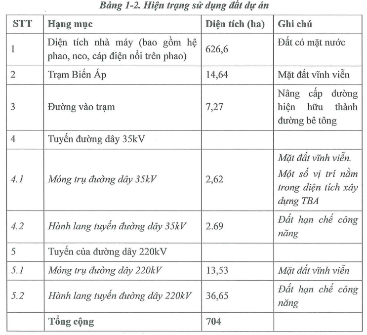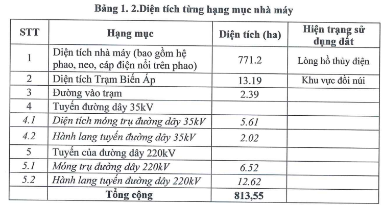 Dự án sử dụng diện tích 704ha, trong đó có 626.6ha là diện tích lòng hồ thủy điện. Các hạng mục bao gồm khu vực nhà máy, công trình phụ trợ, trạm biến áp, khu quản lý vận hành, móng trụ và hành lang tuyến đường dây 220kV/35kV.