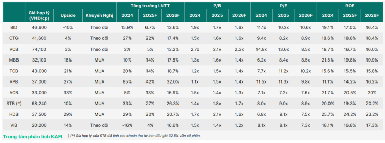 Theo KAFI, có 6 cổ phiếu được khuyến nghị mua trong nhóm này, bao gồm: HDB, TCB, ACB, VPB, MBB và STB. Ngoài triển vọng lợi nhuận tích cực, nhóm chuyên gia đánh giá cao ROE như một chỉ báo trung tâm cho câu chuyện định giá. Khi mặt bằng định giá P/B của ngành đã quay về quanh trung bình 5 năm vào cuối 2025, những ngân hàng duy trì ROE ở mức 20% trở lên sẽ có dư địa lớn để được thị trường trả mức P/B cao hơn.