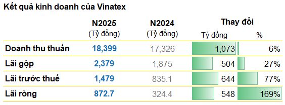 So với kế hoạch năm 2025, Vinatex vượt nhẹ mục tiêu doanh thu hơn 18,300 tỷ đồng, đồng thời vượt xa chỉ tiêu lợi nhuận trước thuế 910 tỷ đồng, với mức vượt lên tới 62.5%.