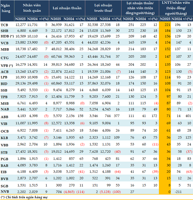 Không còn chạy đua mở rộng quy mô, năm 2025, hệ thống ngân hàng chuyển sang mô hình tinh gọn và hiệu suất cao. Dù cắt giảm gần 1,500 nhân sự, nhưng nhờ tối ưu hóa quy trình và công nghệ, nhiều ngân hàng vẫn báo lãi tăng trưởng đậm với đội ngũ nhân sự có năng suất sinh lời cao.