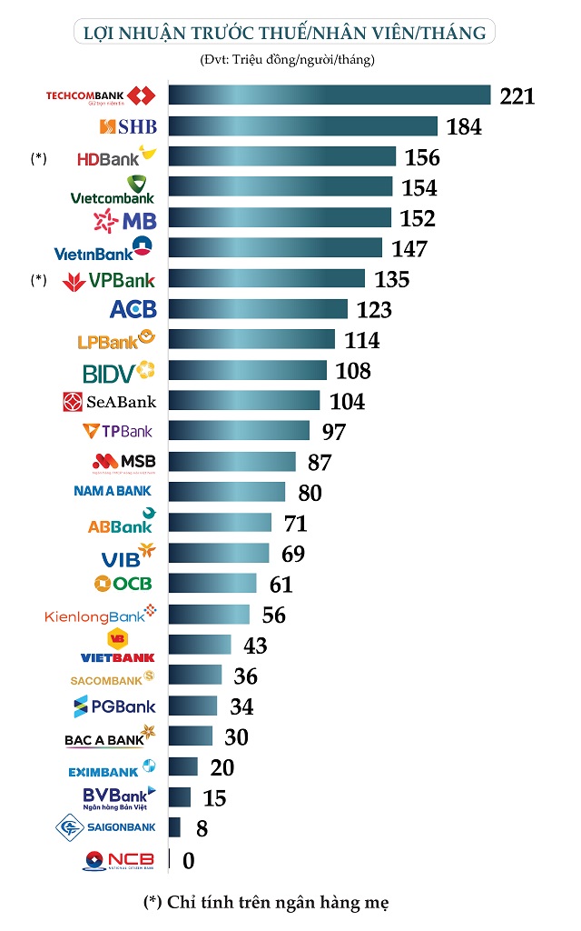 Tính trên lợi nhuận trước thuế, TCB vẫn là ngân hàng dẫn đầu về hiệu suất làm việc khi mỗi nhân viên đem về 221 triệu đồng/người/tháng; kế đến là nhân viên SHB (184 triệu đồng/người/tháng), HDB (156 triệu đồng/người/tháng), VCB (154 triệu đồng/người/tháng).