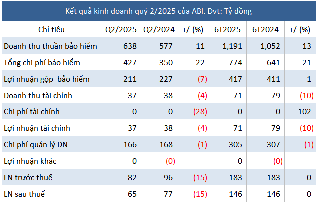 Lũy kế 6 tháng đầu năm, ABI ghi nhận lợi nhuận ròng đi ngang ở mức 146 tỷ đồng. Trong đó, lợi nhuận từ hoạt động kinh doanh bảo hiểm không đổi ở mức 417 tỷ đồng, còn lợi nhuận tài chính giảm 10% xuống 71 tỷ đồng.