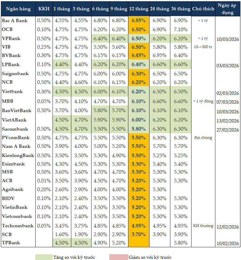 Từ 10/03, VPBank tăng từ 0.2-0.5 điểm phần trăm lãi suất tiền gửi tiết kiệm kỳ hạn từ 6 tháng trở lên. Cụ thể với khoản tiền gửi dưới 1 tỷ đồng, VPBank áp dụng lãi suất kỳ hạn 1-3 tháng như cũ là 4.54%/năm, kỳ hạn 6-9 tháng tăng lên 6.4%/năm, kỳ hạn 12 tháng tăng lên 6.5%/năm và trên 12 tháng tăng lên 6.2%/năm.