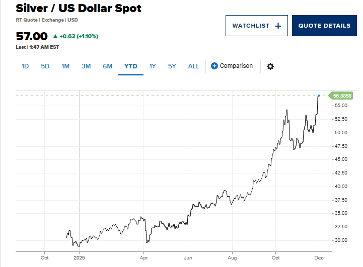Tháng 10/2025 đánh dấu chỉ lần thứ ba trong 50 năm qua giá bạc lập đỉnh mới. Những lần trước đó gồm tháng 1/1980 khi anh em Hunt tích trữ một phần ba nguồn cung thế giới để thao túng thị trường, và năm 2011 sau cuộc khủng hoảng trần nợ Mỹ khiến bạc cùng vàng trở thành tài sản trú ẩn được ưa chuộng.