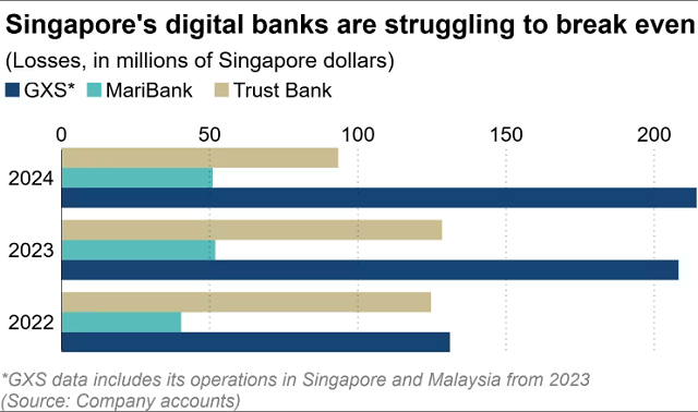 Theo báo cáo tài chính mới nhất, bộ ba ngân hàng số GXS Bank, MariBank và Trust Bank lỗ tổng cộng 358.75 triệu đô la Singapore (tương đương 278.1 triệu USD) cho năm tài chính 2024, chỉ sau hai đến ba năm ra mắt.