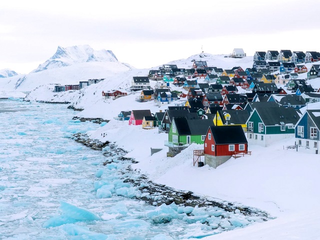 Những ngôi nhà sơn màu truyền thống nhìn ra vùng biển băng tại quận Old Nuuk, gần ngọn núi Sermitsiaq ở Nuuk, Greenland, vào ngày 03/04/2025. Bloomberg | Bloomberg | Getty Images