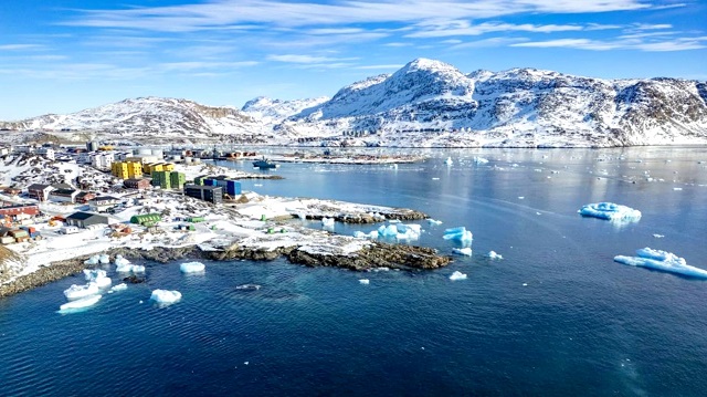Cảnh quay trên không cho thấy các tảng băng trôi nổi trên mặt nước dưới ánh mặt trời, với hậu cảnh là các tòa nhà ngoài khơi Nuuk, Greenland, vào ngày 11/03/2025 - ngày bầu cử lập pháp của vùng lãnh thổ tự trị Đan Mạch này. Odd Andersen | Afp | Getty Images