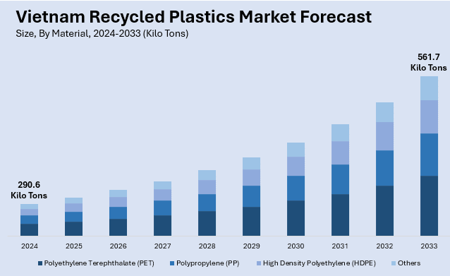 Thị trường nhựa tái chế Việt Nam dự kiến sẽ tăng từ 290.6 ngàn tấn năm 2024 lên 561.7 ngàn tấn vào năm 2033, với tốc độ tăng trưởng kép hàng năm (CAGR) 7.22%. Sự tham gia tích cực của các nhà đầu tư trong nước và nước ngoài dự kiến sẽ làm tăng tổng công suất thiết kế của các cơ sở tái chế PET lên gấp 4 lần trong năm 2023[23].
