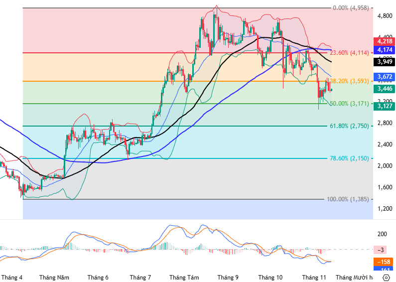 Theo khung đồ thị tuần, giá ETH đã thất bại trong quá trình kiểm tra lại đỉnh cũ tháng 12/2024 (tương đương vùng 3,900-4,100 USD) và đang nằm dưới đường Middle của Bollinger Bands. Điều này cho thấy một tín hiệu phá vỡ giả (fail breakout) với độ tin cậy cao đã hình thành.