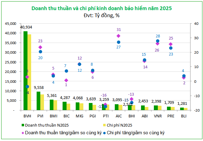 Tuy nhiên, nếu nhìn ở góc độ tăng trưởng, thị trường lại chứng kiến sự bứt phá đầy bất ngờ từ các doanh nghiệp quy mô nhỏ. AIC đã ghi nhận mức lãi cả năm gấp 2.4 lần cùng kỳ dù con số tuyệt đối chỉ dừng lại ở 39 tỷ đồng, trong khi BHI cũng gây ấn tượng với lợi nhuận tăng gấp đôi, đạt mức 24 tỷ đồng. Sự kết hợp giữa sức bền của các đại gia đầu ngành và đà tăng trưởng đột biến của nhóm doanh nghiệp nhỏ đã tạo nên một năm 2025 tích cực cho khối phi nhân thọ.