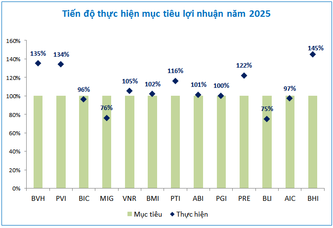 Trong khi phần lớn các doanh nghiệp bảo hiểm khác cũng đã thuận lợi cán đích lợi nhuận trong năm 2025, thị trường vẫn ghi nhận những gam màu trầm lặng hơn từ những kế hoạch còn dang dở. Điển hình là BLI và MIG, hai đơn vị này đã phải khép lại năm tài chính với sự tiếc nuối khi tỷ lệ thực hiện kế hoạch chỉ dừng lại ở ngưỡng 75-76%. Ở một vị thế khả quan hơn, AIC và BIC dù đã nỗ lực bám đuổi sát sao nhưng vẫn còn thiếu một chút bứt phá cuối cùng để chạm tay được đến vạch đích.
