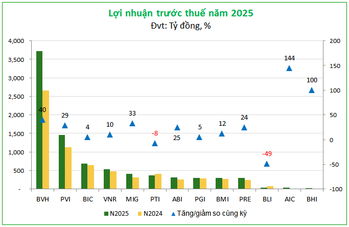 Nhìn từ cuộc “hạ cánh mềm” của năm 2025, có thể thấy sức bật của ngành bảo hiểm phi nhân thọ đang dựa trên hai chân kiềng BVH và PVI. Hai ông lớn lần lượt ghi nhận mức tăng lợi nhuận 40% và 29% so với năm trước, đóng góp tương ứng 3,715 tỷ đồng và 1,456 tỷ đồng vào lợi nhuận trước thuế toàn ngành.