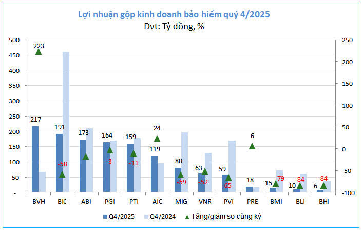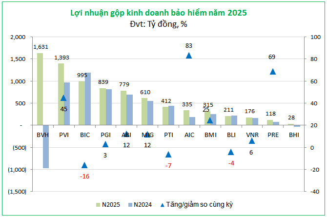 Đáng quan ngại hơn, tình trạng “xuống dốc” này diễn ra trên diện rộng khi đa số doanh nghiệp đều báo cáo kết quả tiêu cực; điển hình là BLI và BHI với mức sụt giảm sâu nhất lên đến 84%. Ngay cả một “ông lớn” vốn dày dạn kinh nghiệm như PVI cũng không thể thoát khỏi vòng xoáy khi chứng kiến lãi gộp mảng bảo hiểm bốc hơi tới 65%.