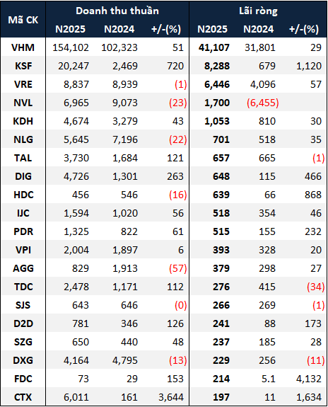 Top 20 doanh nghiệp BĐS có lợi nhuận ròng tăng trong năm 2025. Đvt: Tỷ đồng