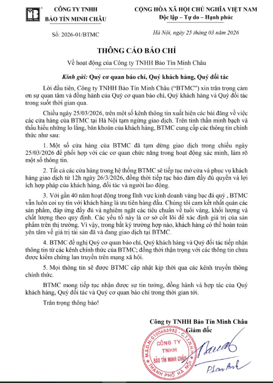 Trong thông cáo phát đi vào lúc nửa đêm 25/03, Công ty TNHH Bảo Tín Minh Châu (BTMC) cho hay một số cửa hàng đang phối hợp với các cơ quan chức năng trong hoạt động xác minh, làm rõ một số thông tin. Tất cả cửa hàng của hệ thống BTMC sẽ tiếp tục mở cửa và phục vụ khách hàng giao dịch từ 12h ngày 26/03/2026.