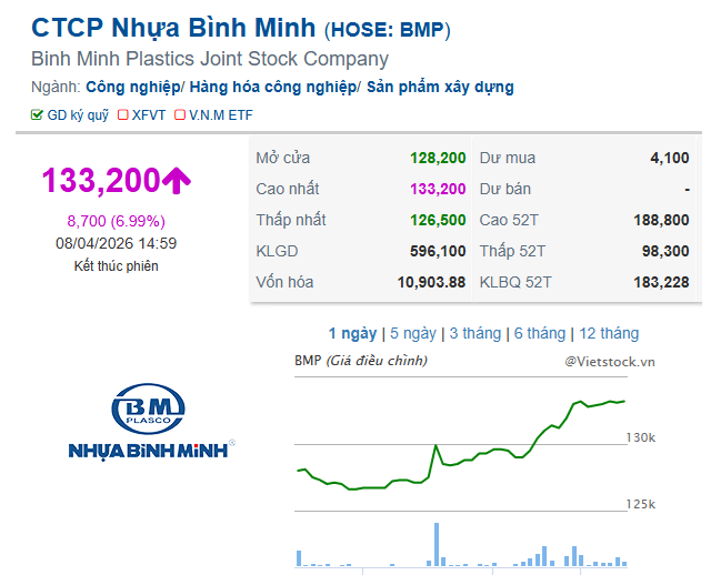 Cổ phiếu BMP bật tăng trần trong phiên 08/04 - Nguồn: VietstockFinance