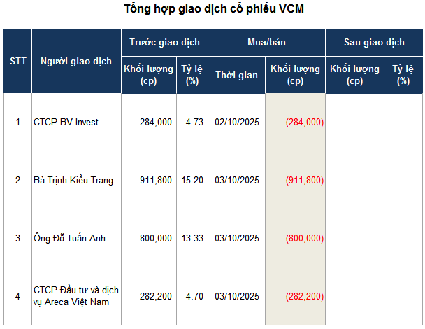 Cụ thể, trong ngày 03/10, bà Trịnh Kiều Trang đã bán toàn bộ 911,800 cp VCM (tương ứng 15.2% vốn) và ông Đỗ Tuấn Anh thoái sạch 800,000 cp (13.33% vốn). Sau giao dịch, cả hai chính thức rút khỏi danh sách cổ đông của Công ty.