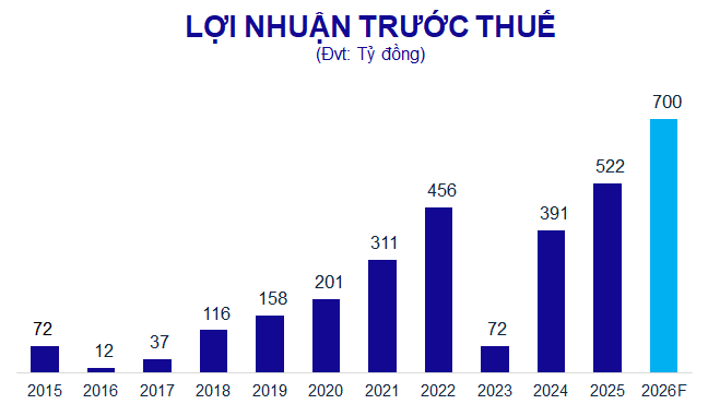 Mục tiêu lợi nhuận trước thuế đạt 700 tỷ đồng trong năm 2026, tăng 34% so với kết quả năm trước.