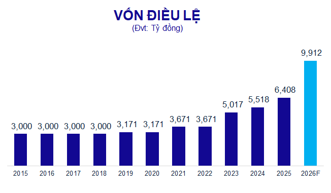 Tại phiên họp ĐHĐCĐ bất thường năm 2025, ĐHĐCĐ đã thông qua phương án tăng vốn điều lệ 2026 thêm 3,504 tỷ đồng.