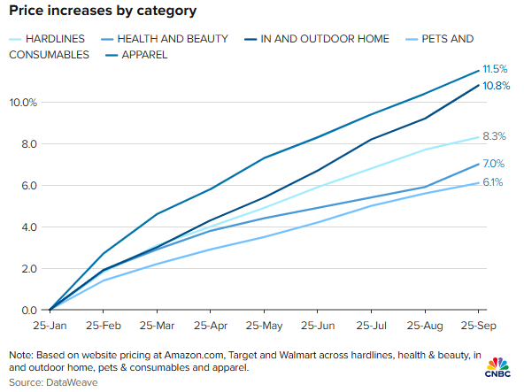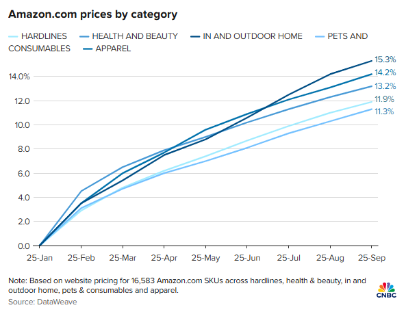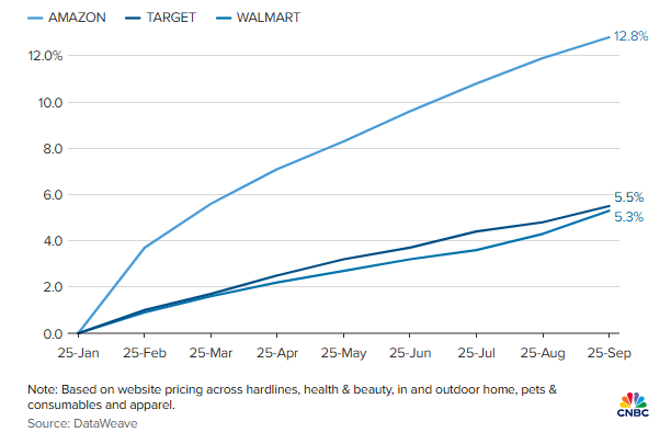 Theo phân tích dữ liệu từ công ty nghiên cứu thị trường DataWeave, giá trên nền tảng Amazon đã tăng trung bình 12.8% tính đến cuối tháng 9 năm nay. Con số này cao hơn nhiều so với mức tăng 5.5% tại Target và 5.3% tại Walmart trong cùng kỳ. Nghiên cứu đã xem xét khoảng 16,000 mặt hàng trên mỗi trang web của ba nhà bán lẻ lớn này.