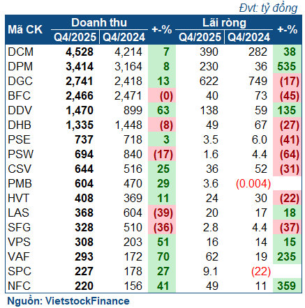Với nhiều động lực tăng trưởng, các doanh nghiệp phân bón kết thúc năm 2025 tương đối thành công với mức tăng trưởng mạnh. Trong khi đó, nhóm doanh nghiệp hóa chất có phần hụt hơi trong quý 4, kéo theo kết quả lũy kế sụt giảm.
