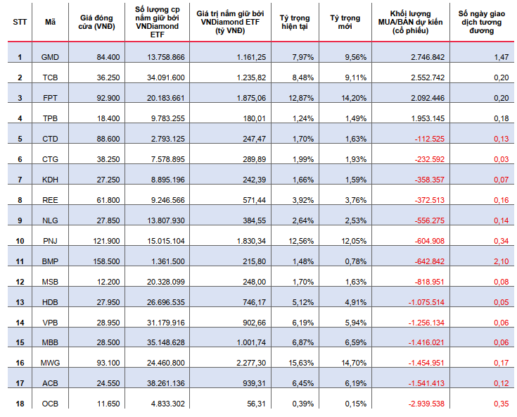 Theo dự báo của MBS Research, dù không có thay đổi về thành phần cổ phiếu trong chỉ số VNDiamond, nhưng việc điều chỉnh tỷ trọng sẽ tạo ra những luồng giao dịch đáng kể từ các quỹ ETF.