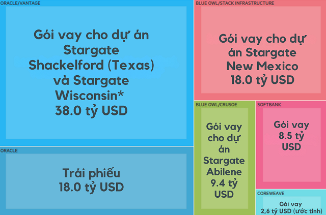 Oracle đã bán 18 tỷ USD trái phiếu doanh nghiệp để chi trả các cam kết hạ tầng với OpenAI. Các nhà phân tích của KeyBanc Capital Markets dự đoán Oracle có thể phải vay 100 tỷ USD trong 4 năm tới để thực hiện hợp đồng với OpenAI. Con số này có thể bao gồm gói nợ 38 tỷ USD cho các trung tâm dữ liệu Vantage đang phát triển tại Texas và Wisconsin.