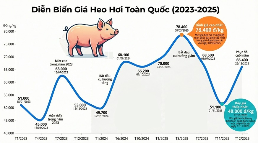 Dù vậy, đến nửa cuối tháng 11, lượng heo bị bán tháo do ảnh hưởng của dịch bệnh và lũ lụt dần cạn. Giá heo tăng gần 39% chỉ sau 1 tháng, lên quanh mức 66,500 đồng/kg tính đến 25/12. Trong đó, một số tỉnh miền Bắc chạm ngưỡng 70,000 đồng/kg.