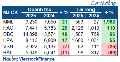 Chiều ngược lại, VSN ghi nhận giảm lãi 26%, còn 82 tỷ đồng, do giá heo hơi trung bình cao hơn năm trước. Riêng BAF, khoản lỗ nặng tại quý 4 đã bào mất “nhân bánh chưng” của Doanh nghiệp, khép lại 2025 với 98 tỷ đồng lãi ròng, rơi 69%.