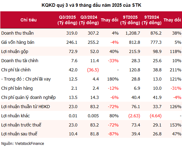 Tính chung 9 tháng năm 2025, doanh thu của STK đạt gần 1,209 tỷ đồng, tăng 38% so với cùng kỳ; lợi nhuận ròng hơn 39 tỷ đồng, tăng 47%. Tuy nhiên, sự cải thiện chủ yếu đến từ mức nền thấp khi cùng kỳ 2024 Công ty từng ghi nhận lỗ ròng gần 56 tỷ đồng do phải ngừng sản xuất và chịu lỗ tỷ giá.