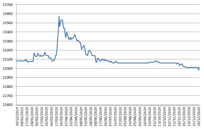 Diễn biến giá mua vào USD tại ngân hàng từ đầu năm 2020 đến ngày 31/12/2020